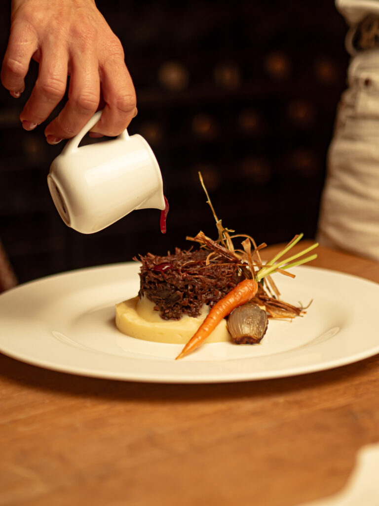 La cocina de caza también encuentra su espacio con un delicioso carpaccio de solomillo de ciervo, acompañado de frutos rojos, mostaza y alcaparras, una combinación que dialoga con el gusto medieval por los contrastes dulce-salado.