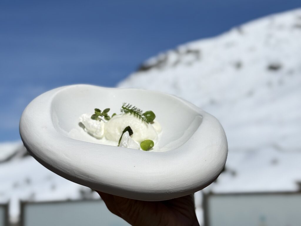 Entre todas las elaboraciones destacó un plato completamente inédito, aún en fase de desarrollo y todavía ausente de la carta del restaurante. Inspirado en la lana del rebaño, exploraba nuevas posibilidades visuales y táctiles, desdibujando la frontera entre lo orgánico y lo comestible. Una pieza que sorprendió por su audacia y que, presentada en plena montaña, adquirió una coherencia casi poética.